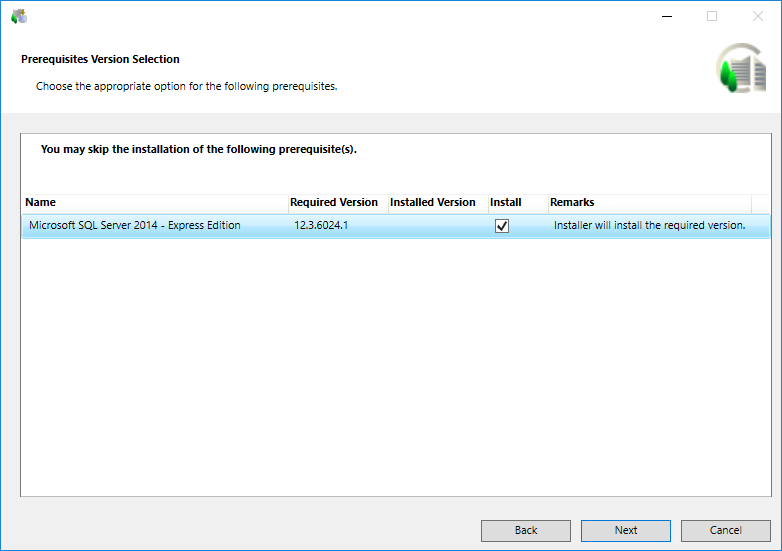 - The Prerequisites Version Selection dialog box displays listing the required versions of the installed prerequisites.