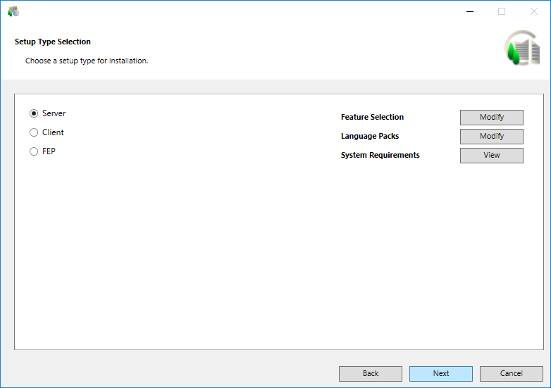 - In the Setup Type Selection dialog box click Next to proceed with the default feature selection and the default language pack selection for the default Setup type - Server.