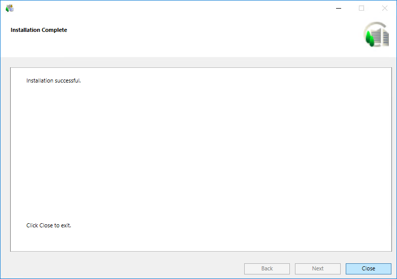 - When the installation program is complete, the Installation Complete dialog box displays. Click Close to complete the installation.