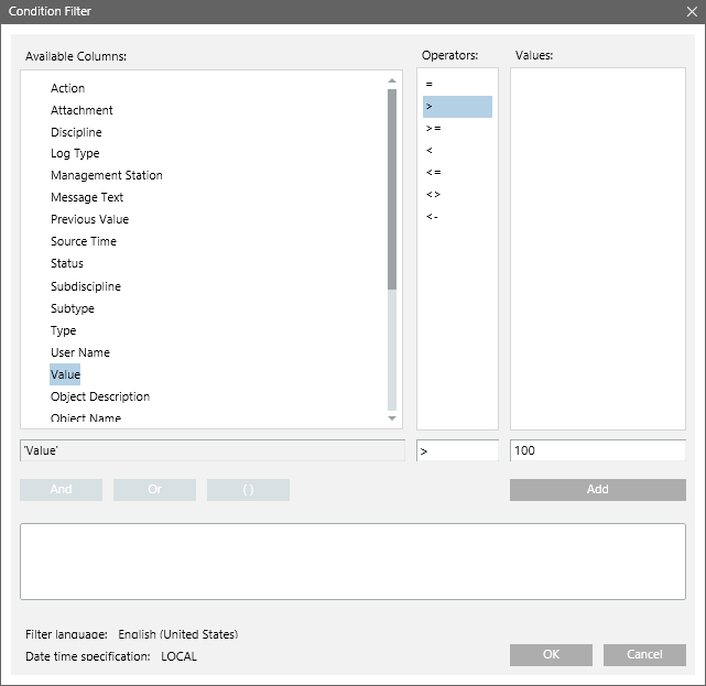- The Condition Filter dialog box displays.