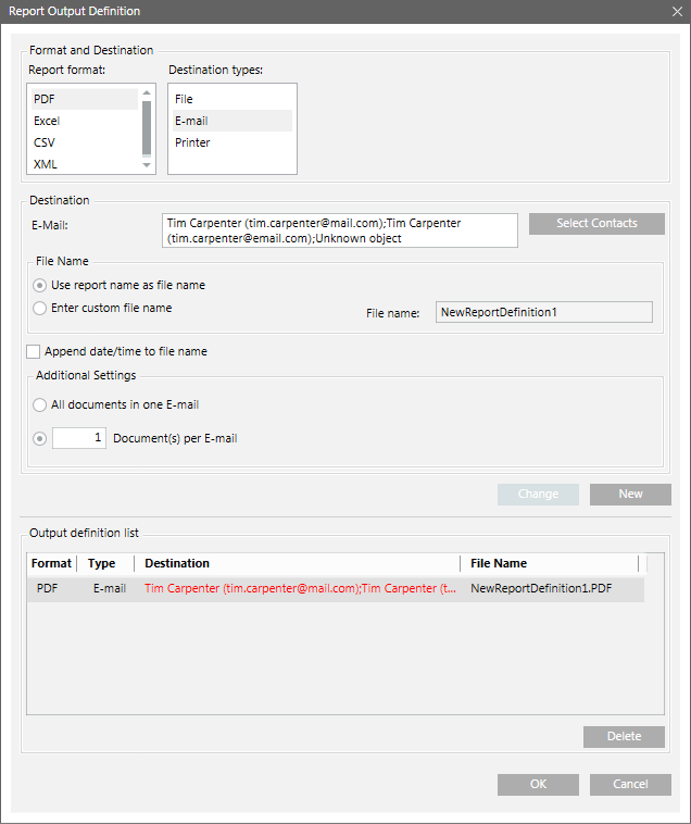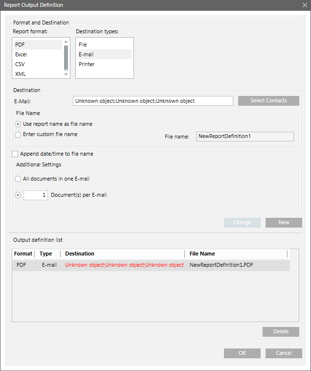 The Output Definition list in the Report Output Definition dialog box and Contacts selection list in the Email Contacts dialog box updates automatically,