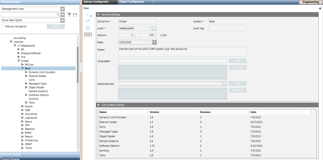 Selecting a library (for example, Events) causes the Library Configurator to display the General Settings and the List of library blocks for that library. Here, authorized experts can modify or delete the selected library.