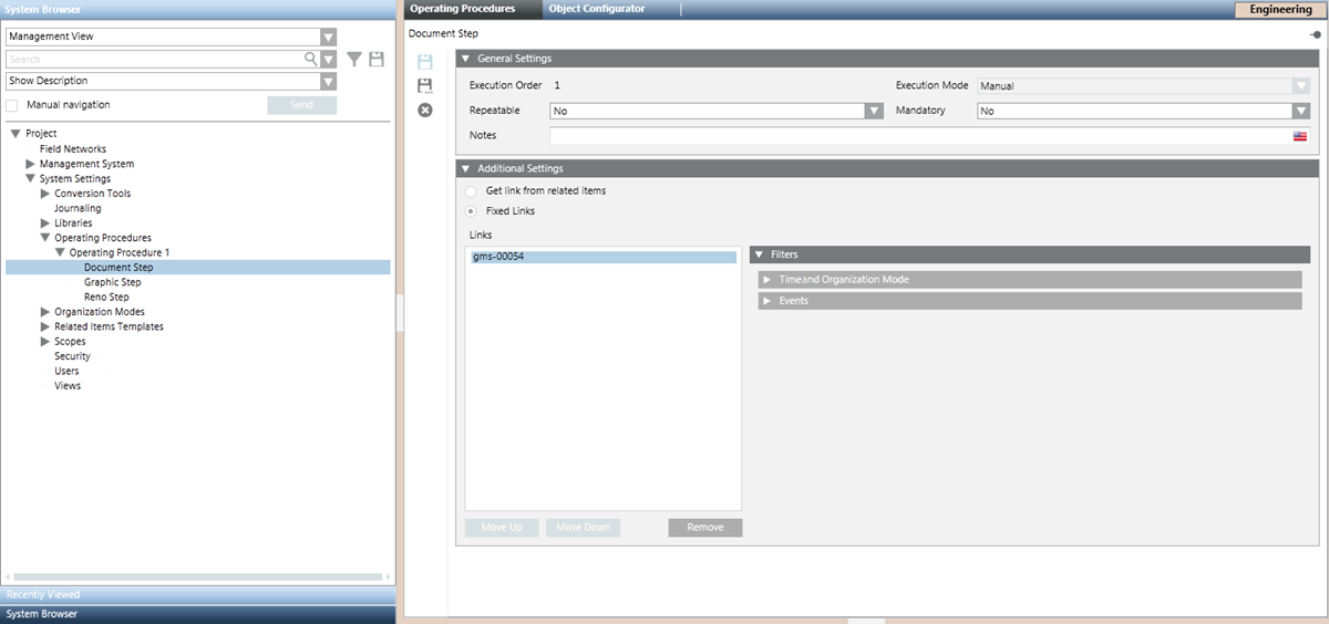 When you configure an operating procedure and select a procedure step in System Browser, a workspace displays where you can configure the settings for that step.