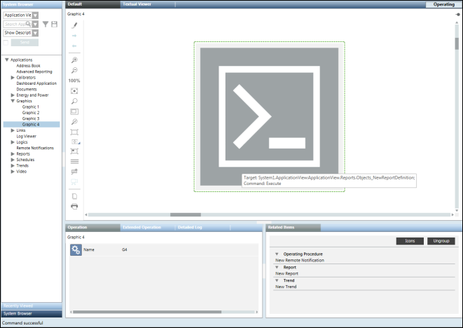 In System Browser, expand the Reports folder and drag-and-drop the report definition to be executed to the window labeled Untitled in the Graphics editor.