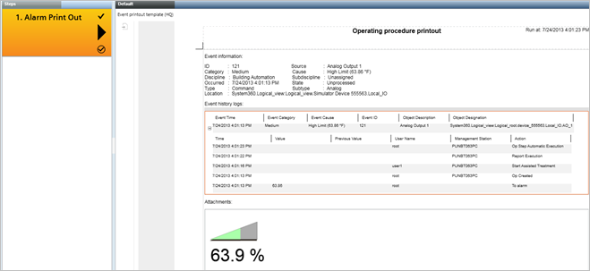 You are in the Assisted Treatment window, and the operating procedure includes an alarm printoutstep that you must manually execute. For background information about the Desigo CC reporting feature, see the reference section.