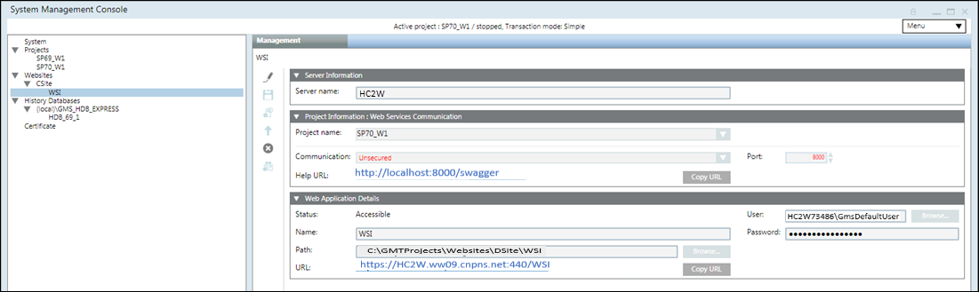 In the SMC tree, select Websites > [Website name]. a. Select the Management tab. b. Select the existing Web Services application. c. In the Web Application Details expander, click Copy URL.