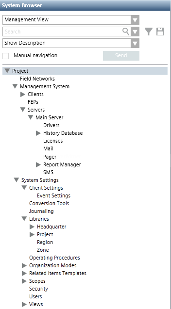 The Management View is predefined and includes all the objects pertaining to its overall management such as: representation of the field site, the computer networking, and other site project settings. Basically, it provides a depiction centered on the site installation and allows navigation through the hierarchical structure of the project tree. Authorized technicians typically use this view to set up the site project.
