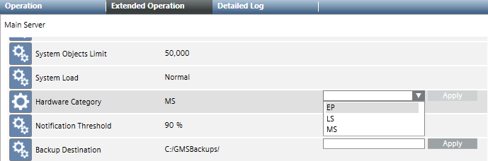 The Extended Operation tab displays the various properties of the Main Server object, which also include those relating to the hardware category and system limits.