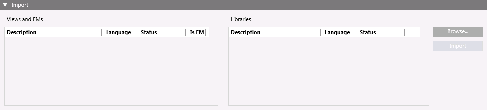 Opens the Select the files to import dialog box, where you can select the View and EMs and Libraries XML files to import.