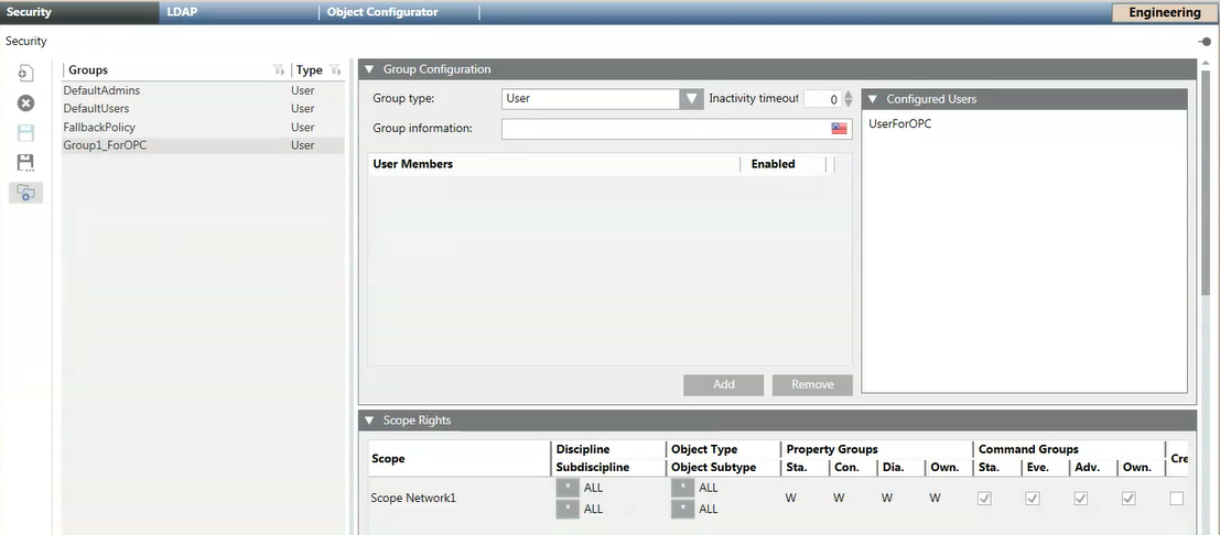 Finally, you must specify the scope rights of the OPC group (see Link Scopes to the OPC User Group).