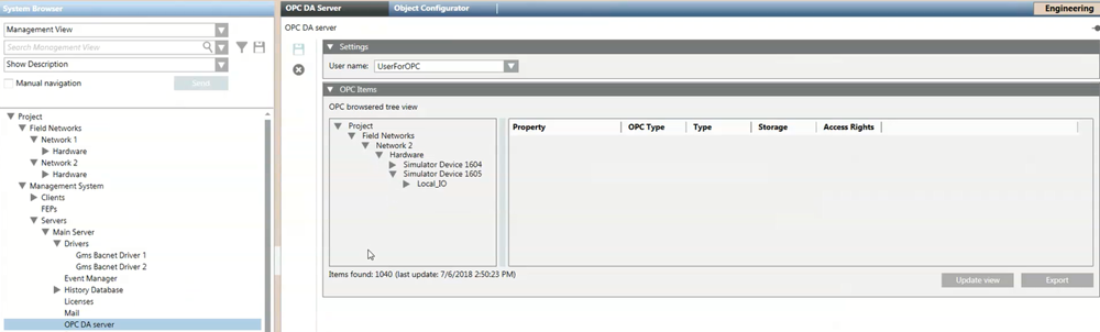 - Click Update view and refresh the OPC DA server data with the latest project data (that is, update in the OPC Items expander the display of the OPC-filtered tree view and its OPC items).