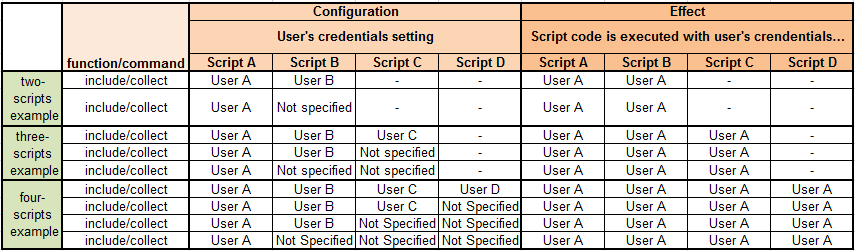 In case of scripts that include or collect other scripts and are executed with user’s credentials, the invoked scripts are executed with the credentials of the invoking script, regardless of the user’s credentials specific settings. See the following table for reference.
