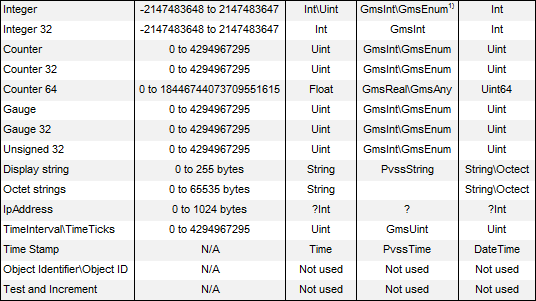 SNMP Data Types | Size | Syntax to use in CSV import file | In Desigo CC Object Model | In Desigo CC SNMP device |