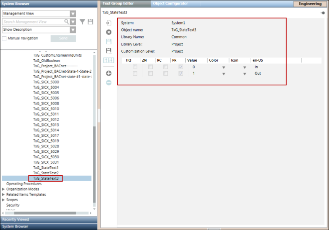 Afterimporting the CSV for such a point, its text group is also added to the list of text groups. The following image displays the Text Group Editor showing the three state texts.