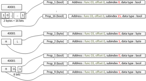Using SubIndex, it is possible to extract only a part of the register's value and represent it as a data point property. This allows an interesting possibility to handle integration of Modbus devices whose registers or data points represent a collection of states. The following example illustrates this: