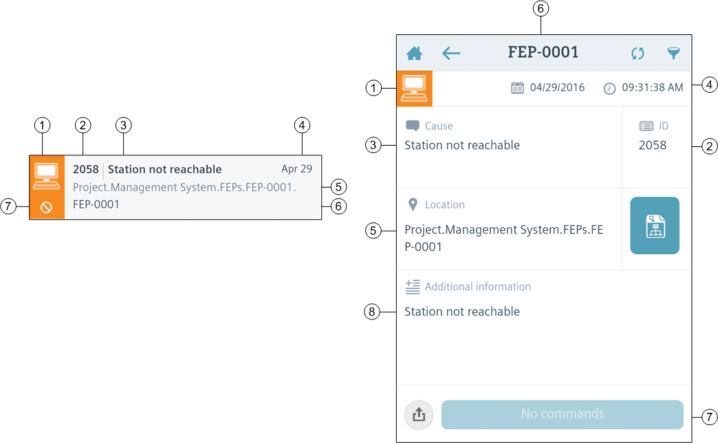 7 | Available command, if any. This can be: Acknowledge If there are two commands available, (for example Silence and Acknowledge): the details screen displays two command buttons, while the event line displays only the icon of the higher-priority command (Acknowledge and Reset take precedence over Silence/Unsilence). |