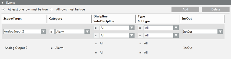 - In some cases, a radio button lets you specify whether all the conditions (AND logic between rows) or only one (OR logic between rows) must be true to assert the Events trigger/filter. If this radio button is absent, there is always an OR logic between the rows (at least one row must be true to assert the trigger/filter)