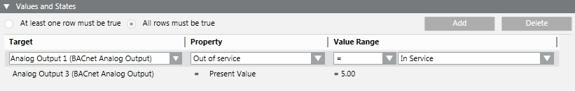 - You can specify whether all of the conditions (AND logic between rows) or only one (OR logic between rows) has to be true to assert the Values and States trigger.
