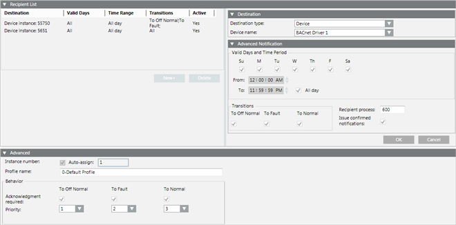 This section defines the notification class object’s recipient list (the list of devices or management stations receiving object alarms). Click New or select an existing destination to display the Destination and Advanced Notification sections. Use these sections to specify a device. To remove a destination from the list, select the destination and click Delete. |