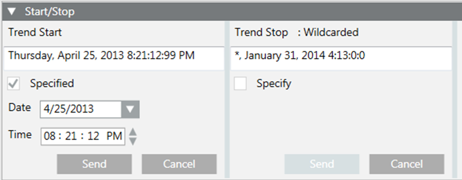 In the Trend Start and Trend Stop sections, the date strings initially display as they are defined in the device. If wildcards are present in any of the values, Wildcarded displays above the date string and the Date and Time fields are hidden.