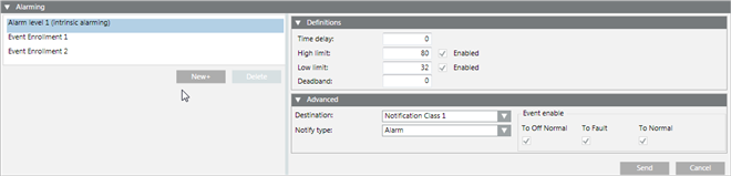 A BACnet object only has one intrinsic alarm. Clicking the New button lets you create a new event enrollment object. Since you cannot delete an intrinsic alarm, the Delete button is unavailable. |