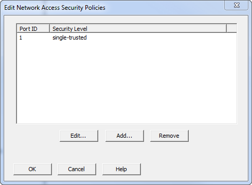The Edit Network Access Security Policies dialog box allows you to edit, add, or remove an associated network access security policy.