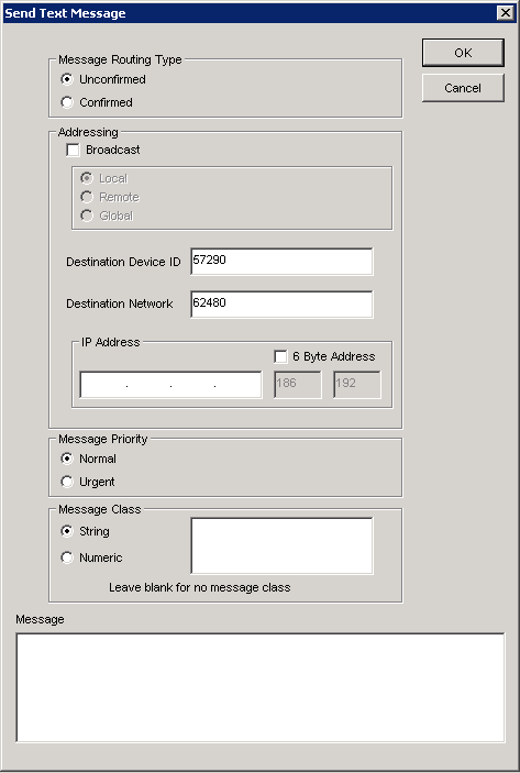 Click this button to send an unconfirmed text message to a device or devices. Unconfirmed messages can also be broadcast to the local subnet, a remote subnet, or globally. |