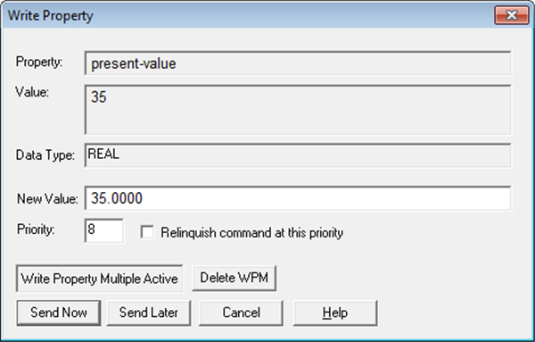 From the system tree, select your BACnet device. The Write Property dialog box is available from many object types and property names.