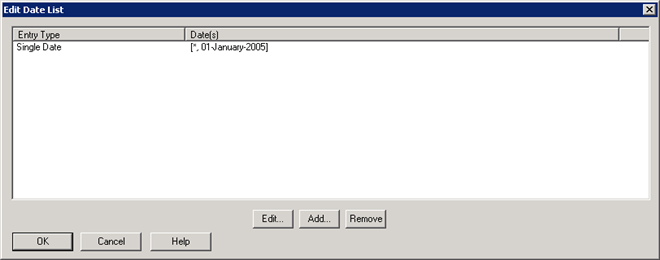 The Edit Date List dialog box allows you to add, modify, and delete entries from the Calendar list. All the entries are listed according to entry type and date.