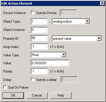From the system tree, expand your BACnet device. From the Commands folder, select an object. In the Property Name column, right-click action and select Write Property. From the Edit Actions dialog box, click the Edit button.