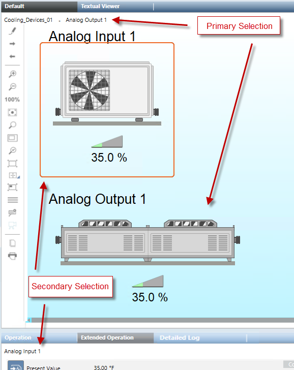 If you click a Symbol on a graphic or, the referenced object of the Symbol becomes the secondary selection, while the primary selection remains the same in System Browser. The following figure illustrates the primary selection in System Browser, Analog Output 1.