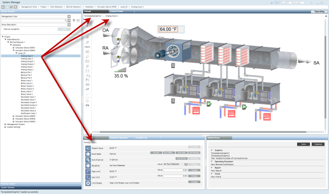 The Graphics Viewer allows you to display dynamic graphics of your building control system. Within System Manager, you navigate the various views of System Browser to select the objects you want to display in the Graphics Viewer. System Browser displays only the objects in the system that you have access to, based on your user profile and privileges.