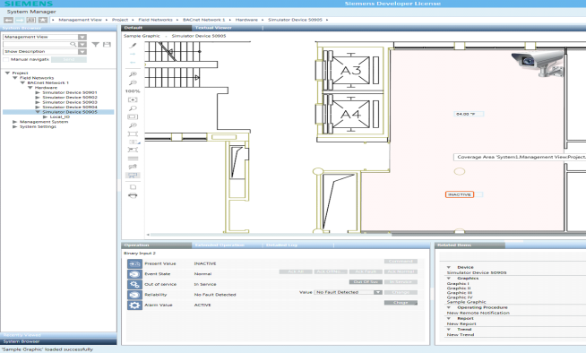 Desigo CC graphics can contain cameras or monitoring devices to which objects, such as fire sensors, ceiling sprinklers, temperature sensors, etc. are associated. For example, you have a graphic of an office space that includes a camera that is monitoring the fire sensors in that room. In this example, the fire sensors monitored by the camera, are in the coverage area of the device.