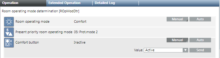 - The Operation tab displays properties Room operating mode and Comfort button.