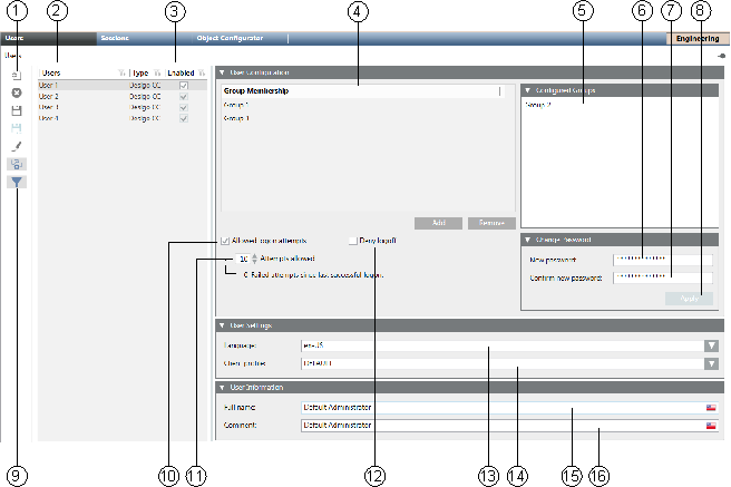 2 | Users | Lists all the defined users with access to Desigo CC. A user name is used to log on to Desigo CC. In a distributed system, the check box in the Global column indicates the type of user. |