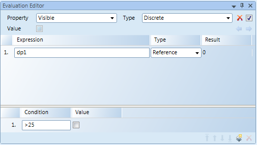 In this example, the objective is to hide the element on the graphic if the value of a given data point (dp1) is larger than the value of 25. The element property Visible receives the evaluation of the expression and depending on the value of the data point, the element is either visible on the graphic or not.
