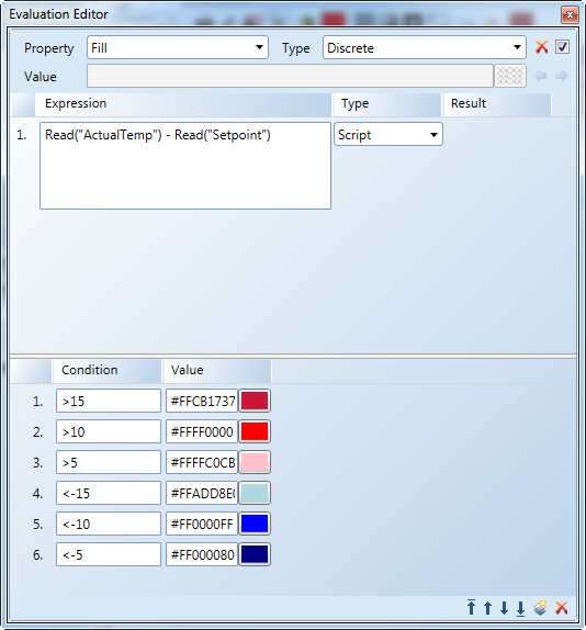 This is the most straightforward and simplest form of using script in an evaluation to represent a changing Fill color of an element. A Discrete type of evaluation with conditions is used. And, a script using two Read() methods is used. The script reads the actual temperature object reference and subtracts the value of the setpoint object reference. The value is examined by the evaluation, and depending on the value, the appropriate condition is chosen and the Fill color is changed.
