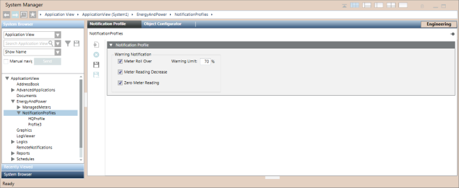 The Notification Profiles workspace provides options to issue warnings in the event of a meter rollover or a meter displaying incorrect values. You can access this application by selecting Application View > EnergyAndPower > NotificationProfiles.