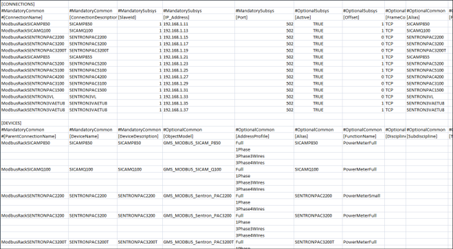 In order to create instances of the Modbus TCP Power Devices, you must create the engineering data in the form of a comma-separated value (CSV) file. A CSV file contains data in which values are represented as text and separated using a separator such as comma (,). This format can be easily edited in simple text editors such as Wordpad or Notepad. More elaborate editing can be done using advanced word processing tools, like Excel. The Importer can parse CSV files which only use the comma (,) as the separator.