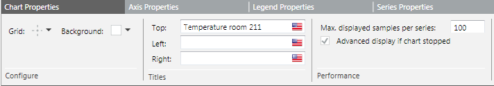 - Titles : A descriptive name required for each Trend View. The name entered displays on the Trend View. You can also add your own title to the left and right axis of the Trend View.