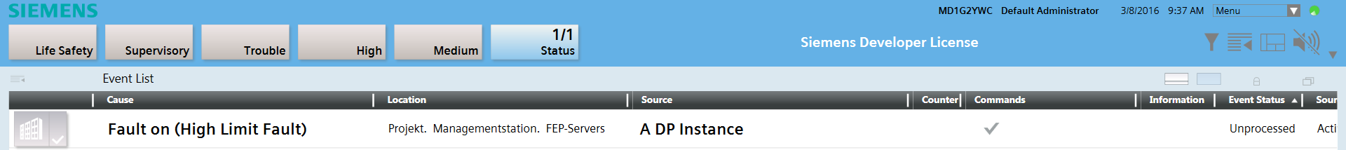 - The alarm is triggered and displayed in the Alarm Summary bar under the alarm category State. In the Cause column, the defined alarm text Fault on as well as the two defined conditions in parenthesis (Top limit Fault) are displayed.