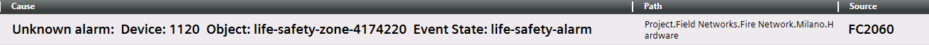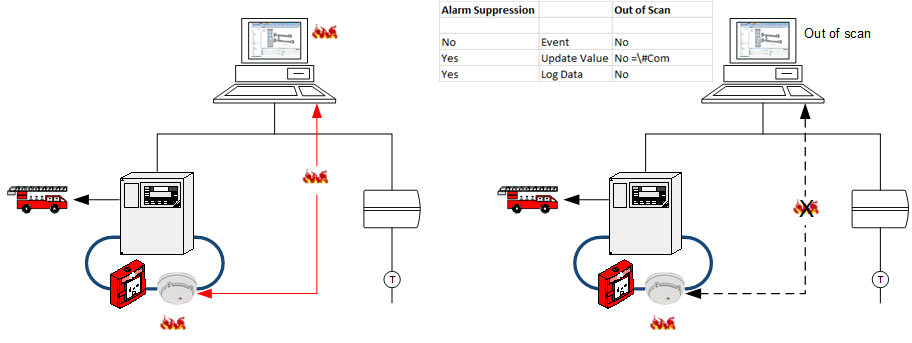 For a number of subsystems, a data point in Out of Scan results in either no alarm at all being displayed or in an unknown alarm. In the latter case, you need to identify the source of the alarm on the local fire panel.