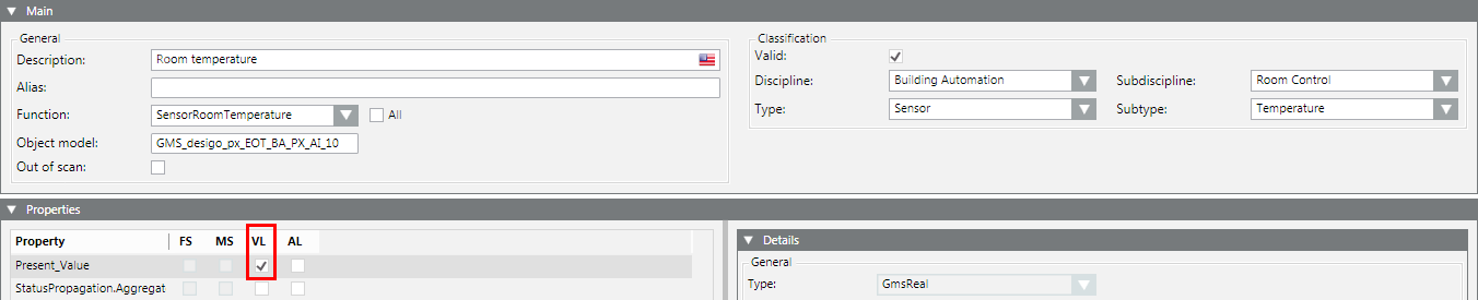 - In the Properties expander, select the corresponding property (for example, Present_Value) and select the VL check box.