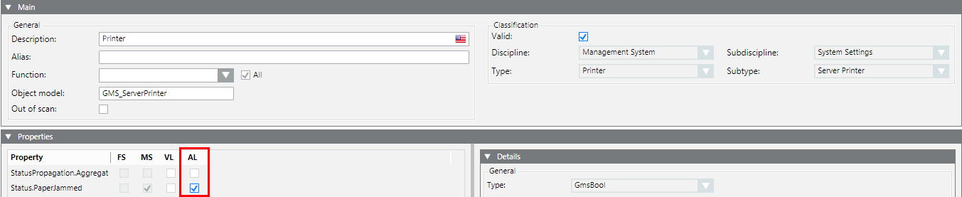 - In the Properties expander, select the corresponding property (for example, Status.PaperJammed) and select the AL check box.