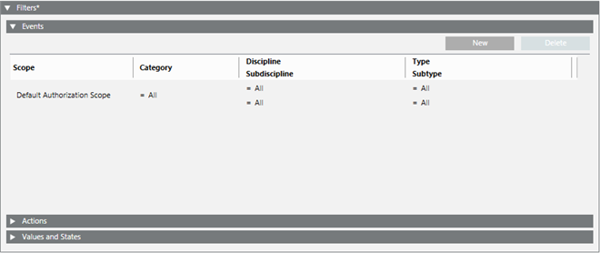 Each events filter occupies one row. An alarm must meet all the criteria on its row to be printed out. There is an OR logic between rows.