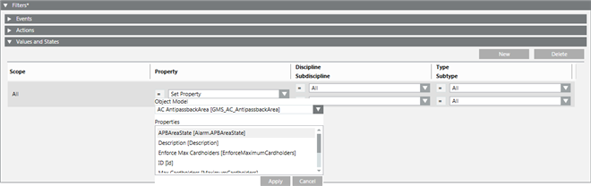 The list of properties display according to the selected Object Model. If All is selected in the Property drop-down list, then all the properties for all the object models are configured.