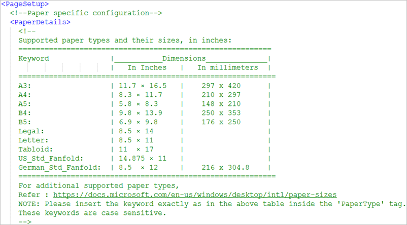 - In the <PageSetp> section of the template file, navigate to the <PaperDetails> section.