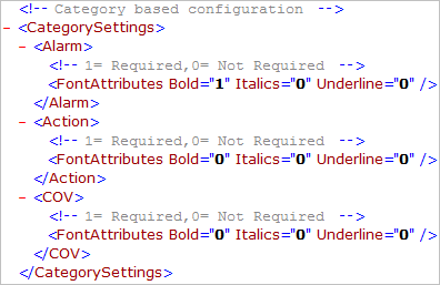 You can also specify the format (bold, italics, or underline) of the printable text according to the type of generated event (Alarm, Action, or COV) in the <CategorySettings> tag. For example, if you want a bold font with no italics and underline format for all Alarm type events, complete the following steps: