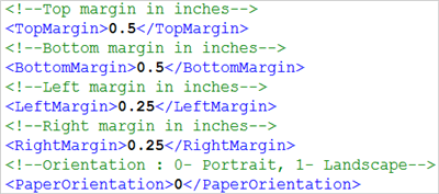 - In the <PaperDetails> section of the template file, enter the values for top, bottom, left, and right margins within the <TopMargin>, <BottomMargin>, <LeftMargin>, and <RightMargin> tags.