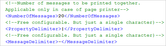 - Enter the value for the total number of messages to print in the <NumberOfMessages> tag. You can also specify the delimiters for separating the columns and messages by entering the respective characters within the <PropertyDelimiter> and <MessageDelimiter> tags.
